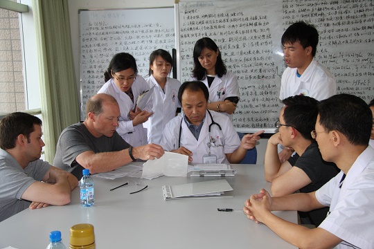 Michael Mangrum教授与杨延宗院长在交流手术方案。