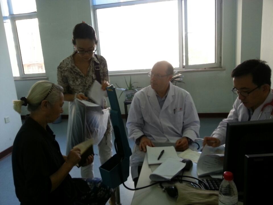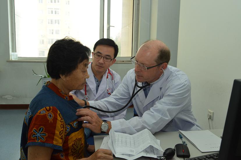 上图为Mangrum教授在门诊由常栋副教授陪同,为患者细心诊治。