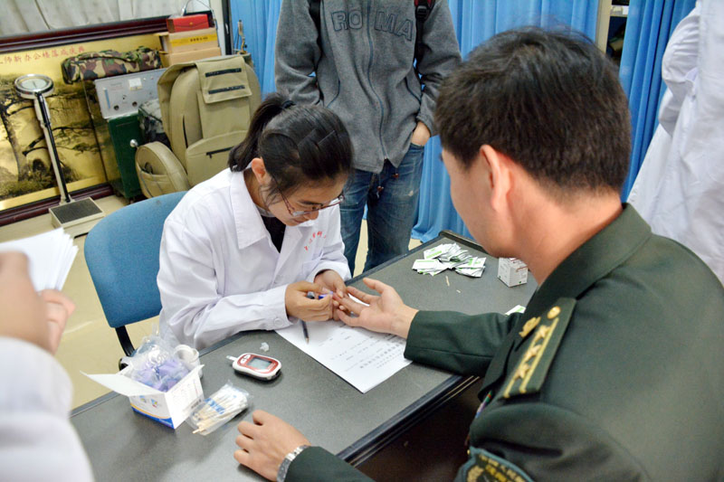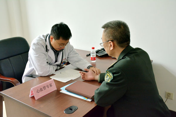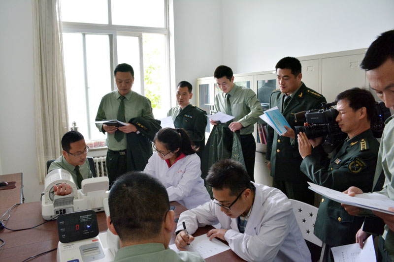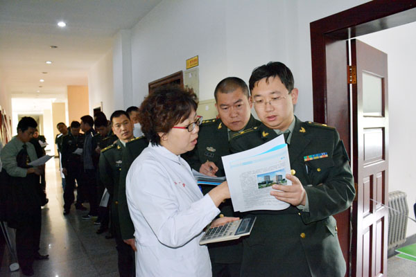 与会官兵认真聆听健康讲座 宣讲结束后,官兵们列队参加体检,我院医护人员坐在临时挂牌的“测身高体重”“测血压”“测血糖”“心电图”“心脏彩超”“诊室1”“诊室2”这7个医务工作室里,熟练地为部队官兵们进行身体及心脏的各项检查。所有项目检查完成后,由心脏病专家夏云龙教授、张波教授、杨光教授及王楠医师对军官们进行健康评估,提出合理化建议,让军人们全面地掌握自身心血管健康状况。