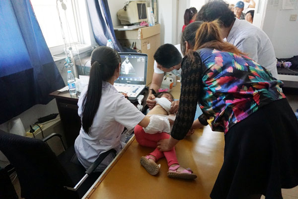 杨岫岩医生在为先天性房缺儿童进行心脏超声检查